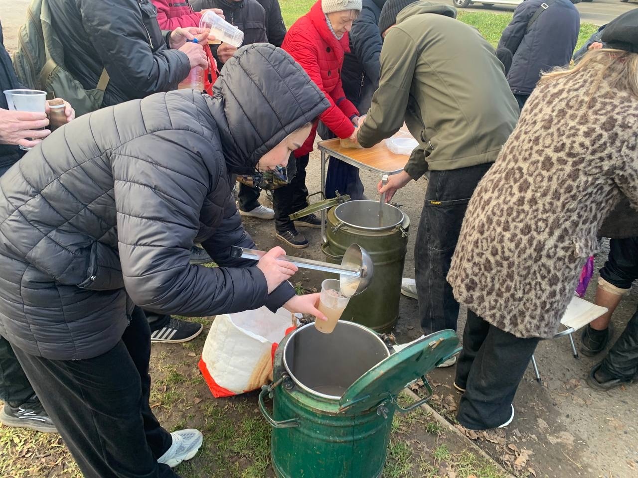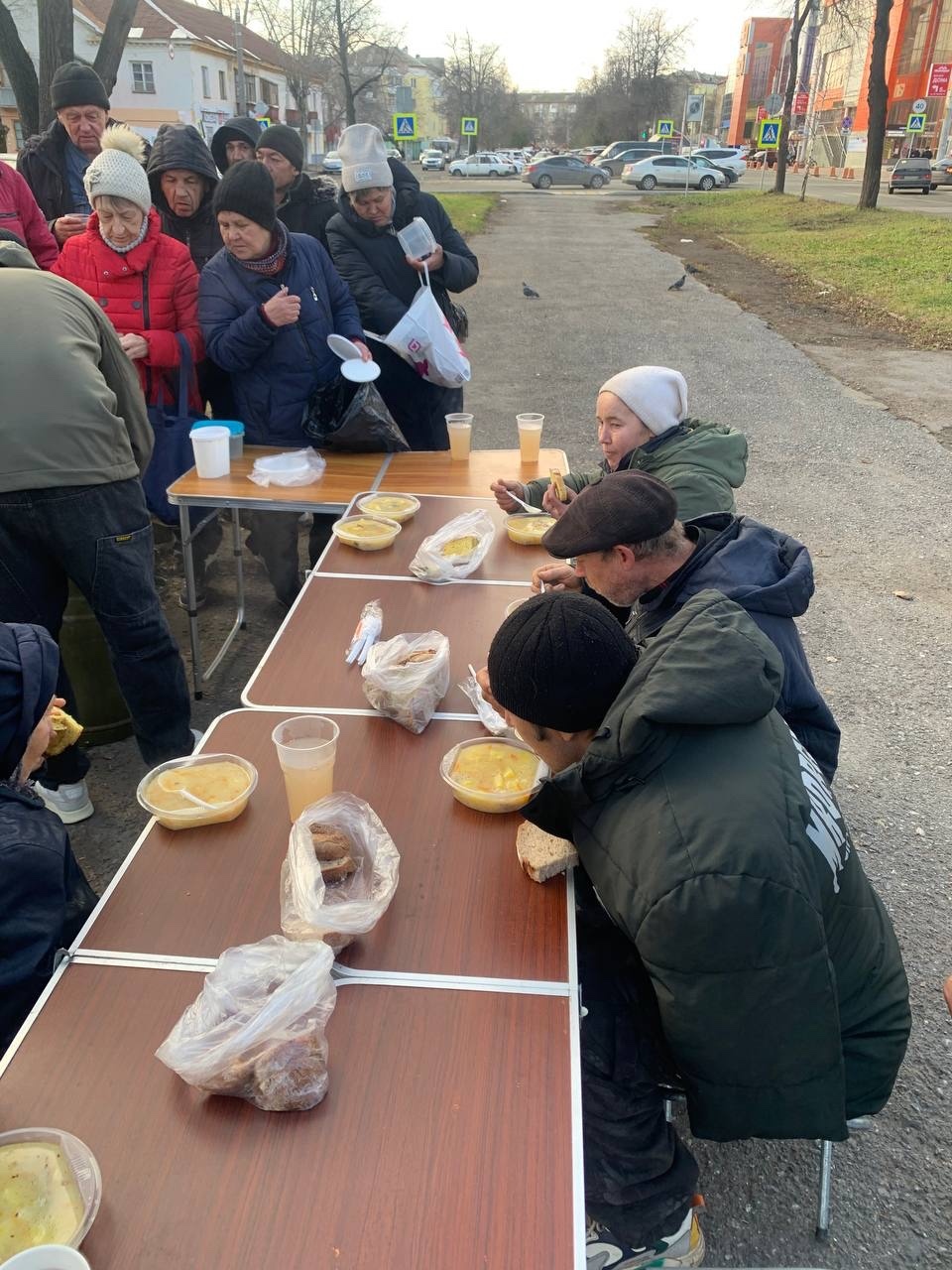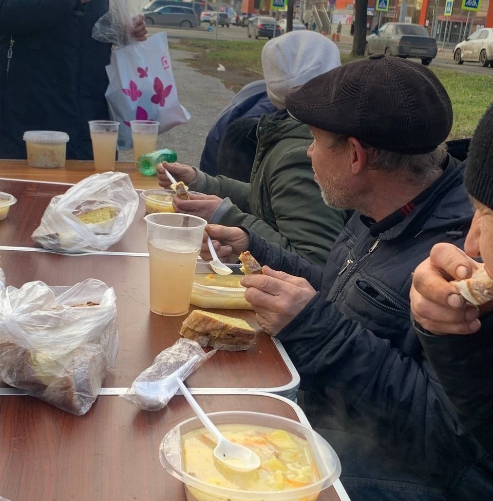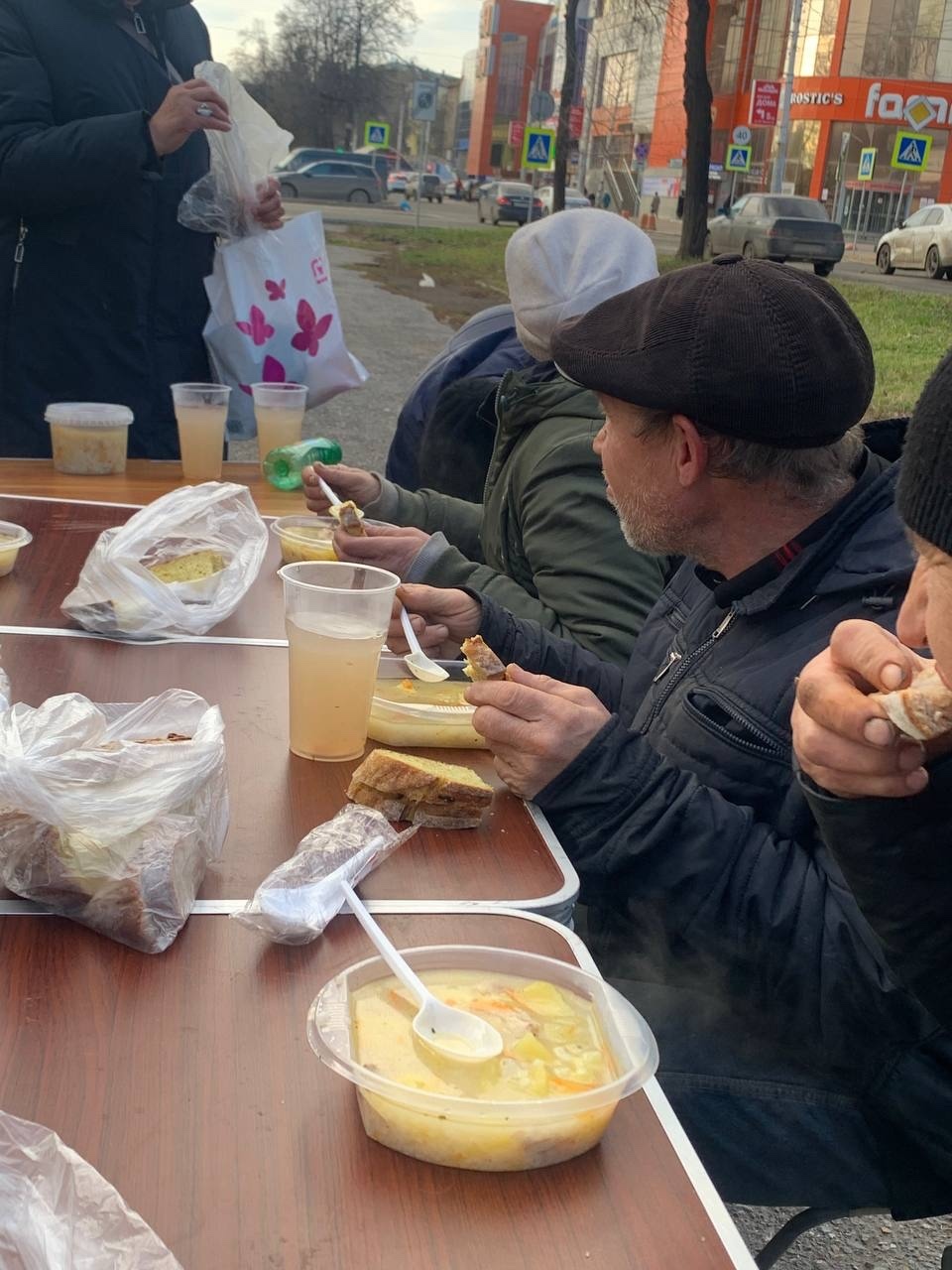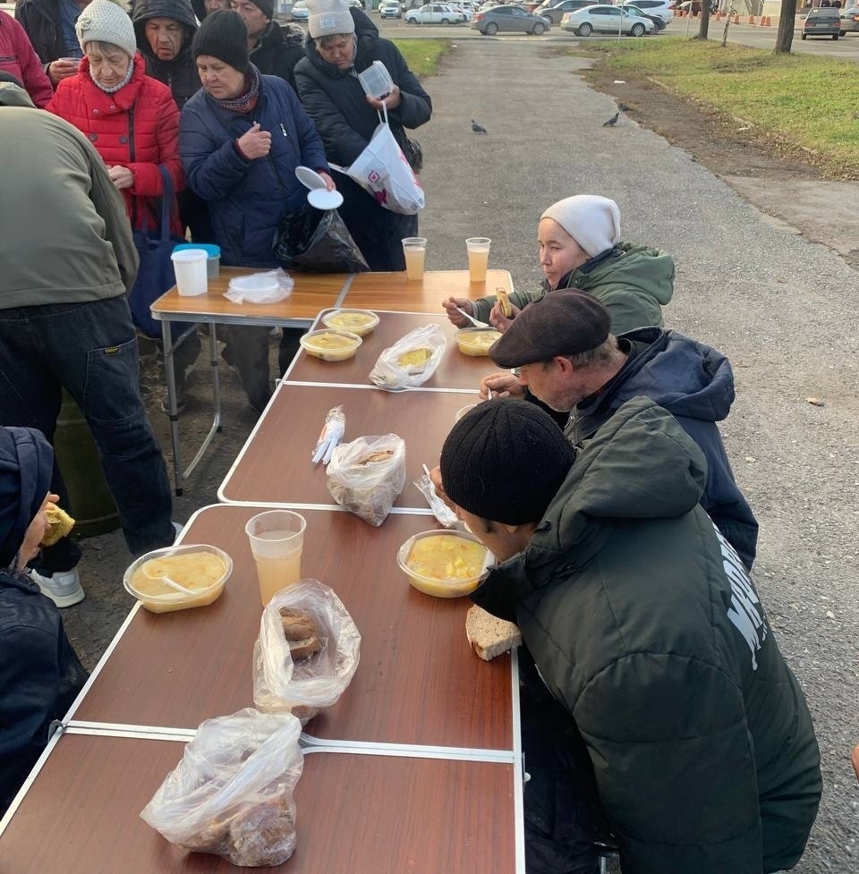 В нашем субботнем меню сегодня — рисовый суп с грибами и курицей, хлеб и фруктовый кисель. Также было много сезонных вещей для раздачи нуждающимся
