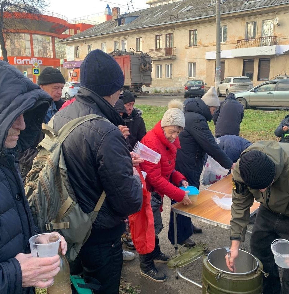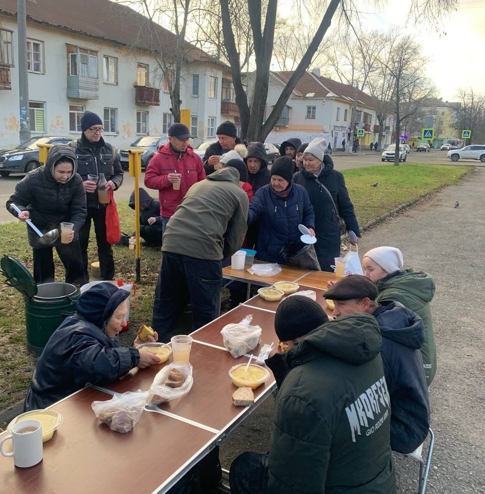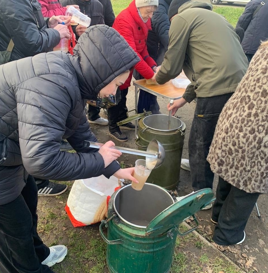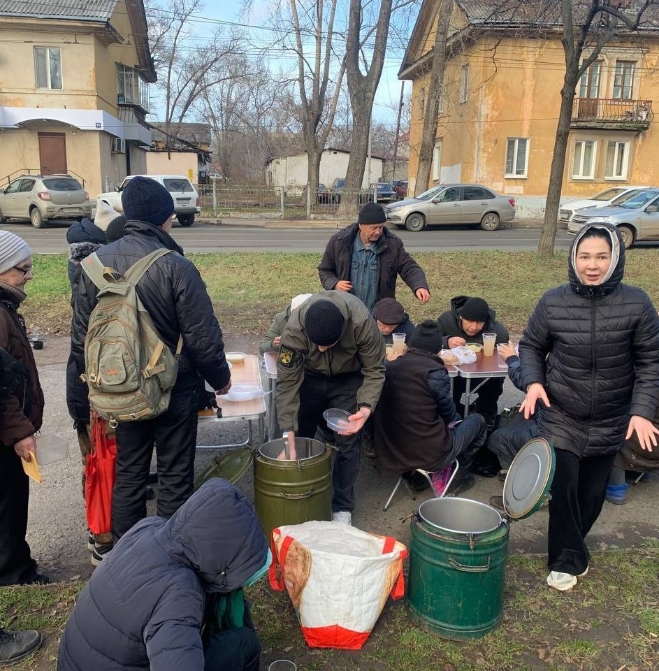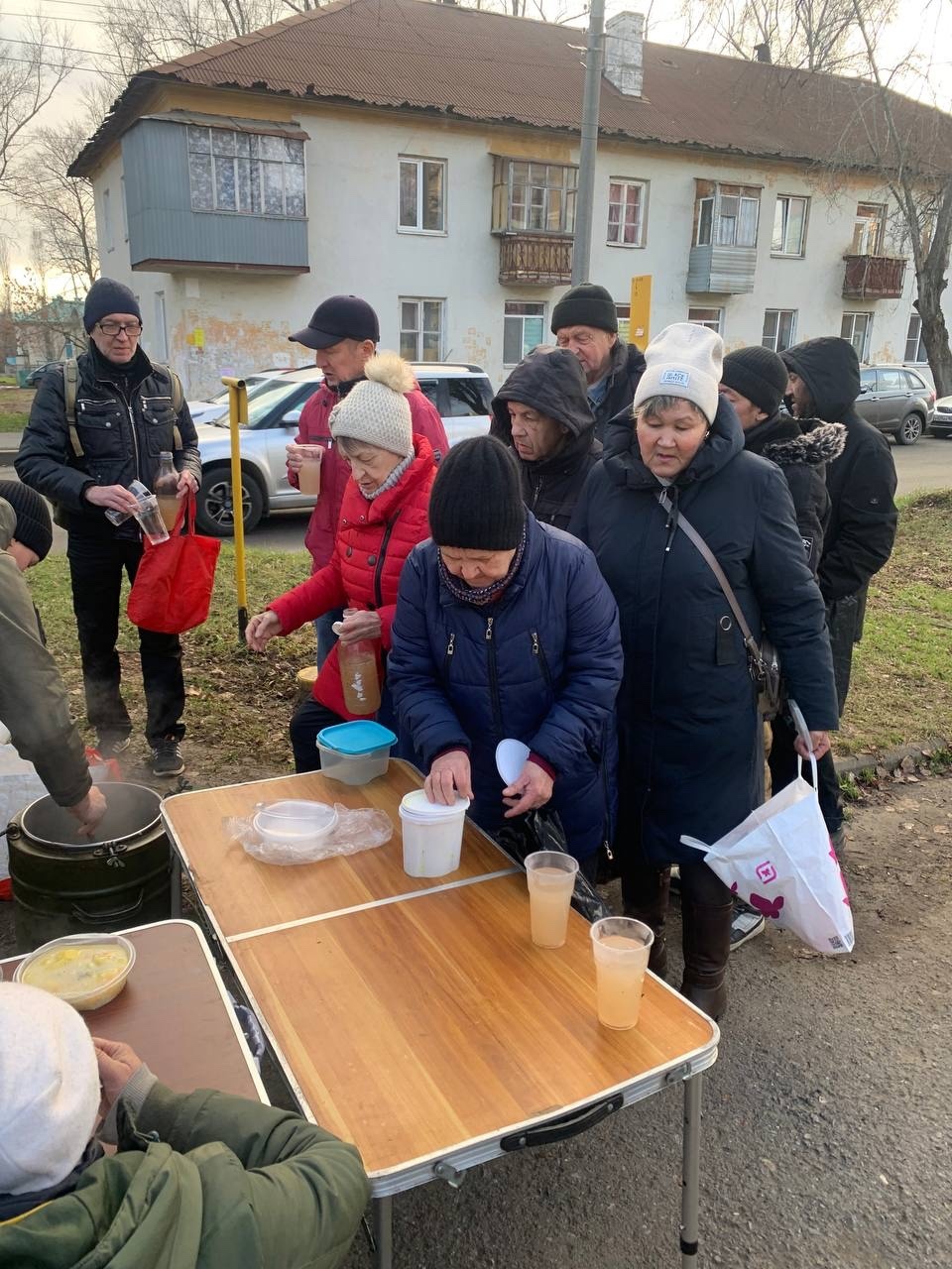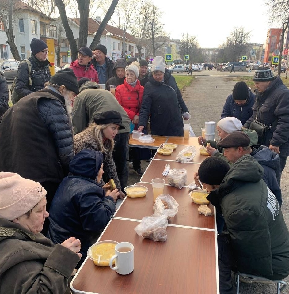 В нашем субботнем меню сегодня — рисовый суп с грибами и курицей, хлеб и фруктовый кисель. Также было много сезонных вещей для раздачи нуждающимся