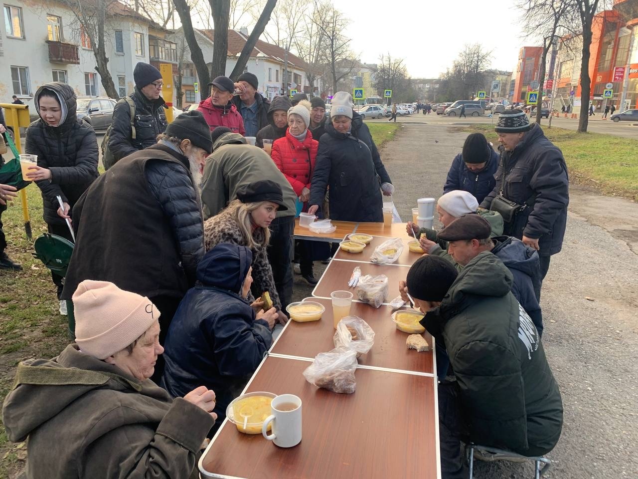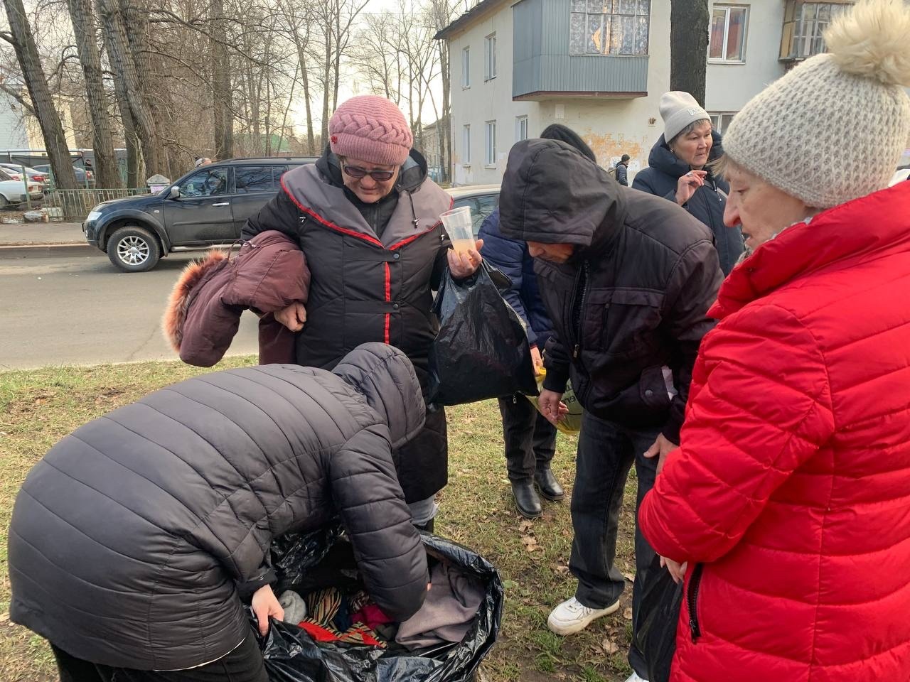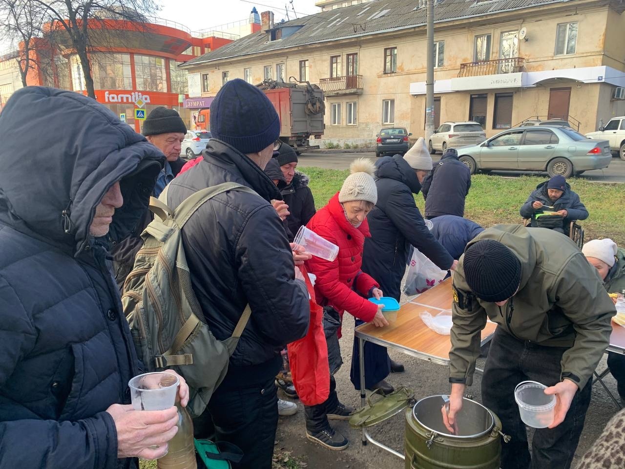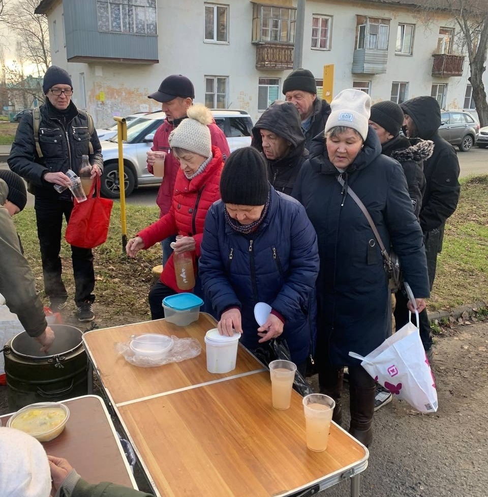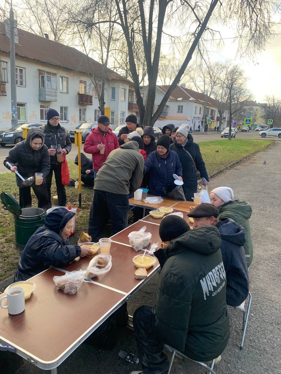 В нашем субботнем меню сегодня — рисовый суп с грибами и курицей, хлеб и фруктовый кисель. Также было много сезонных вещей для раздачи нуждающимся