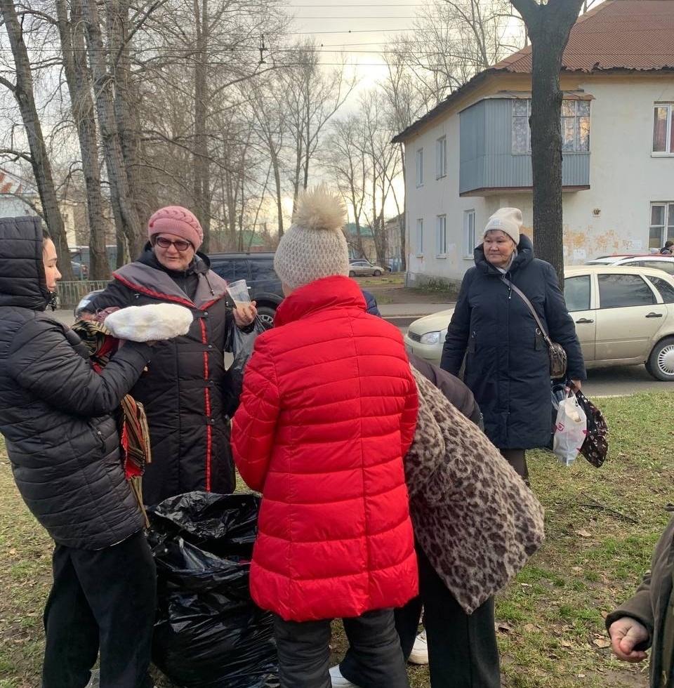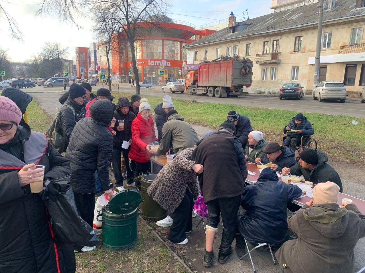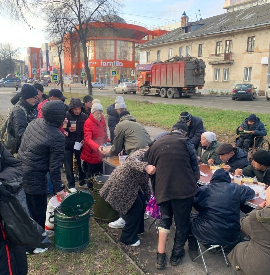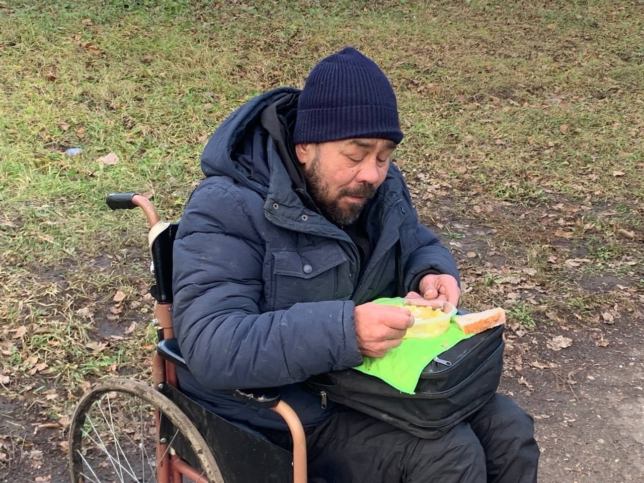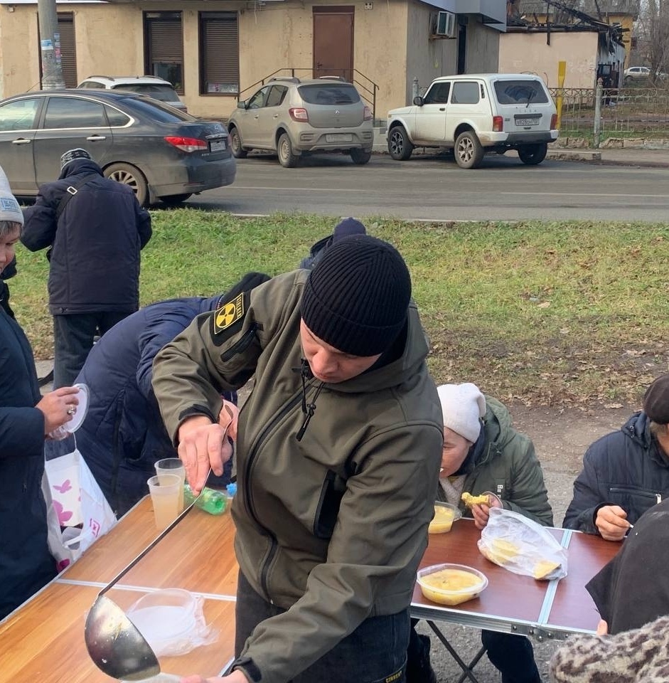 В нашем субботнем меню сегодня — рисовый суп с грибами и курицей, хлеб и фруктовый кисель. Также было много сезонных вещей для раздачи нуждающимся