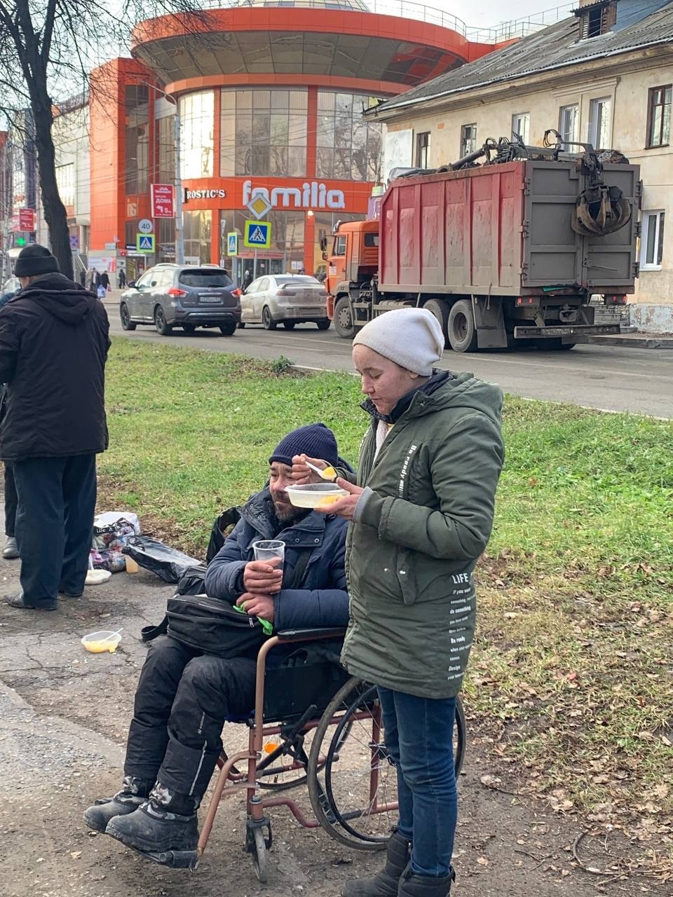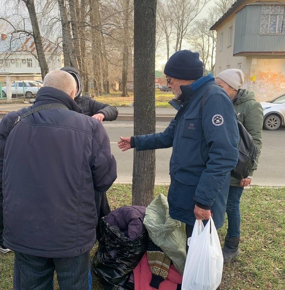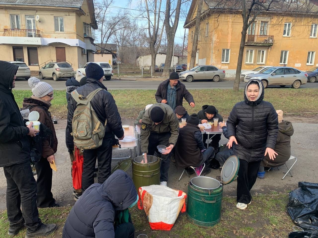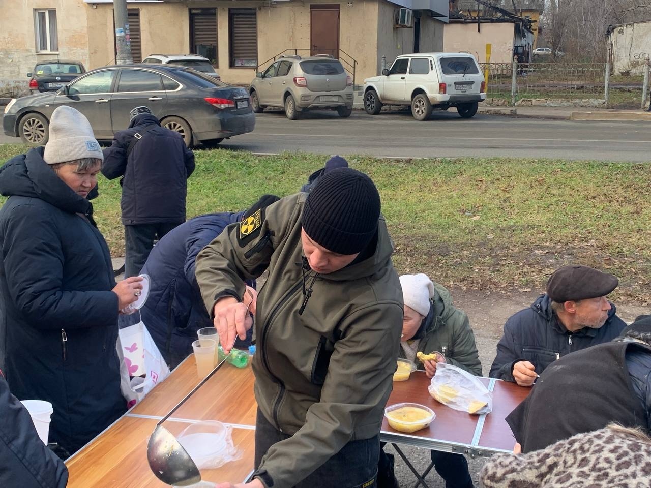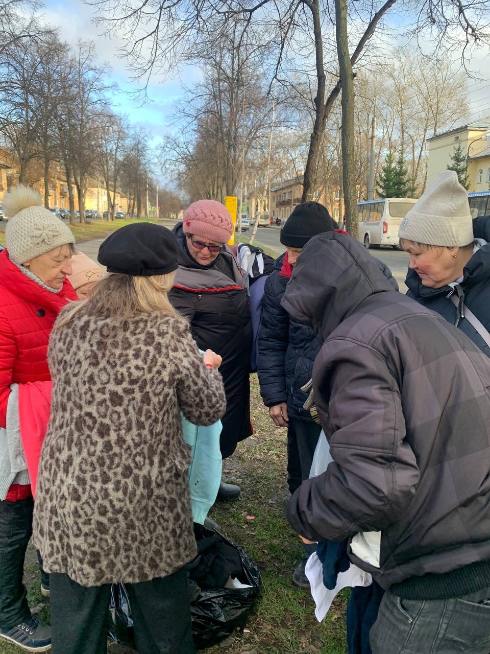 В нашем субботнем меню сегодня — рисовый суп с грибами и курицей, хлеб и фруктовый кисель. Также было много сезонных вещей для раздачи нуждающимся
