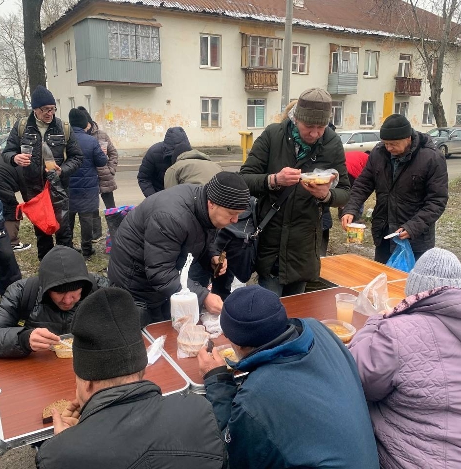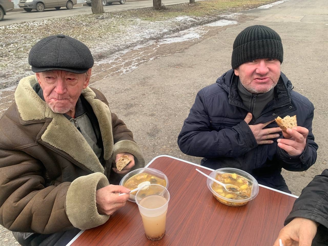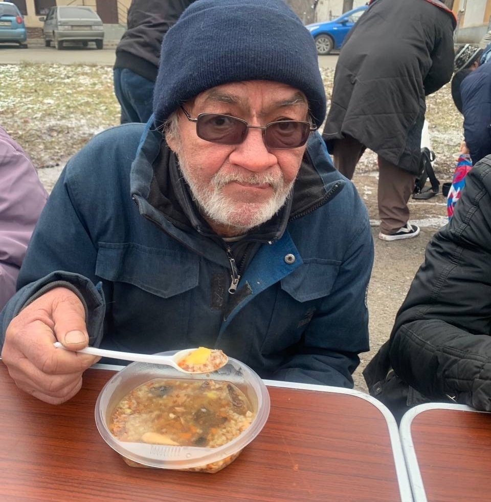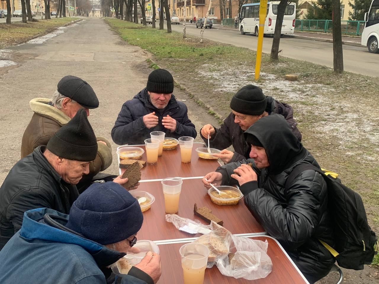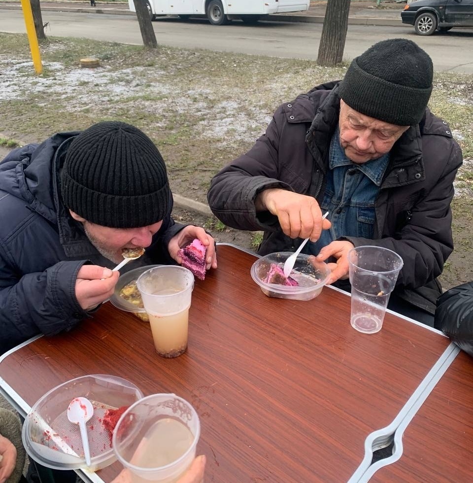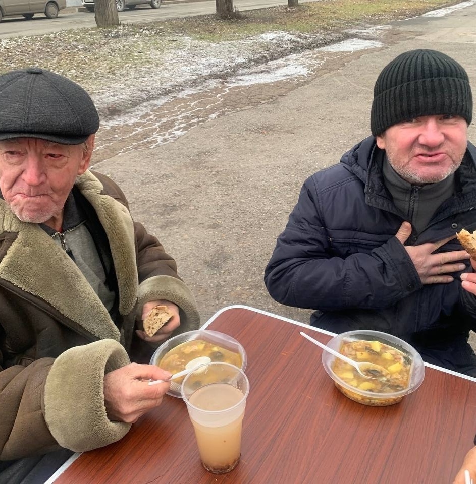 В эту субботу мы привезли нашим подопечным — гречневый суп с курицей, хлеб, кондитерские изделия и фруктовый компот