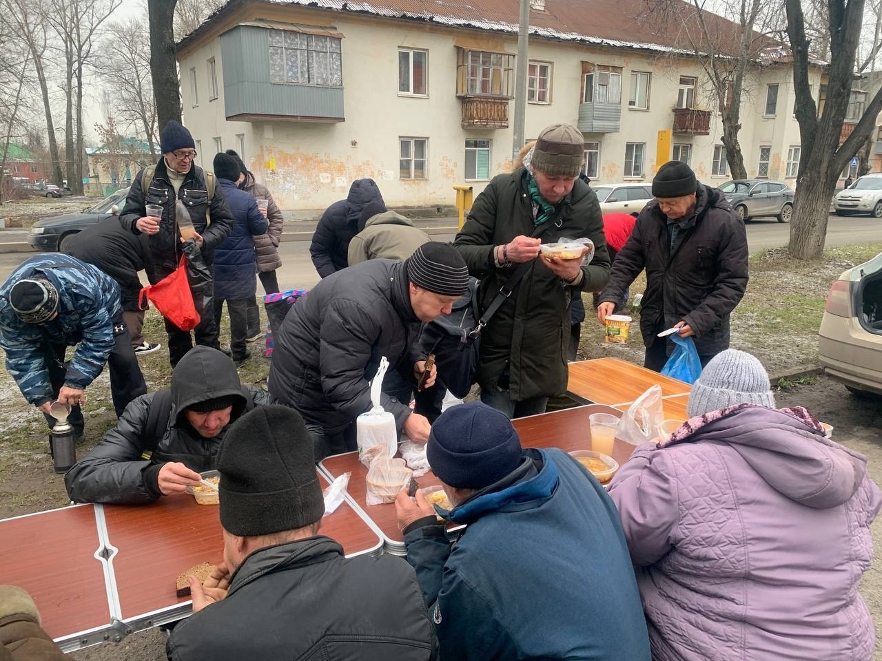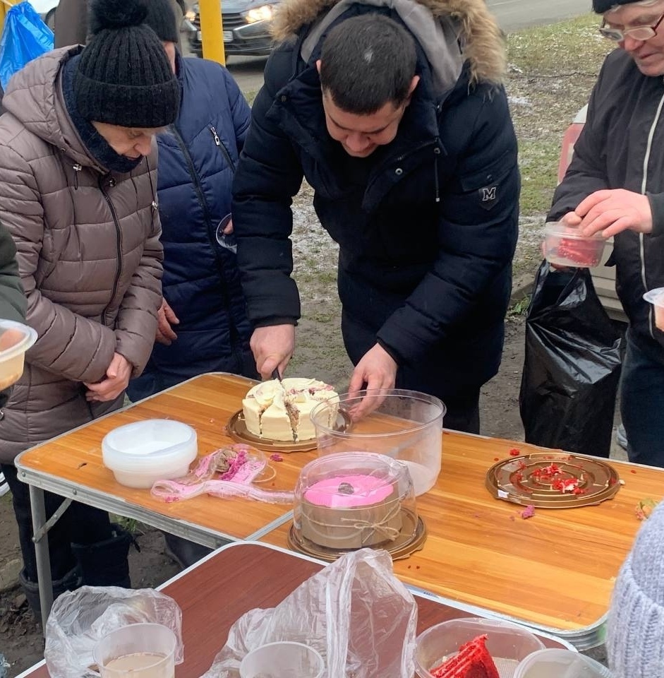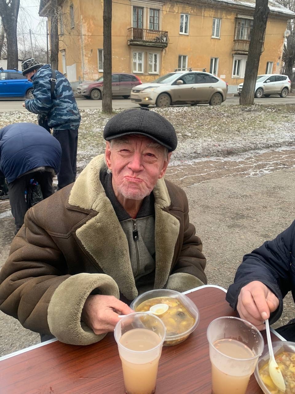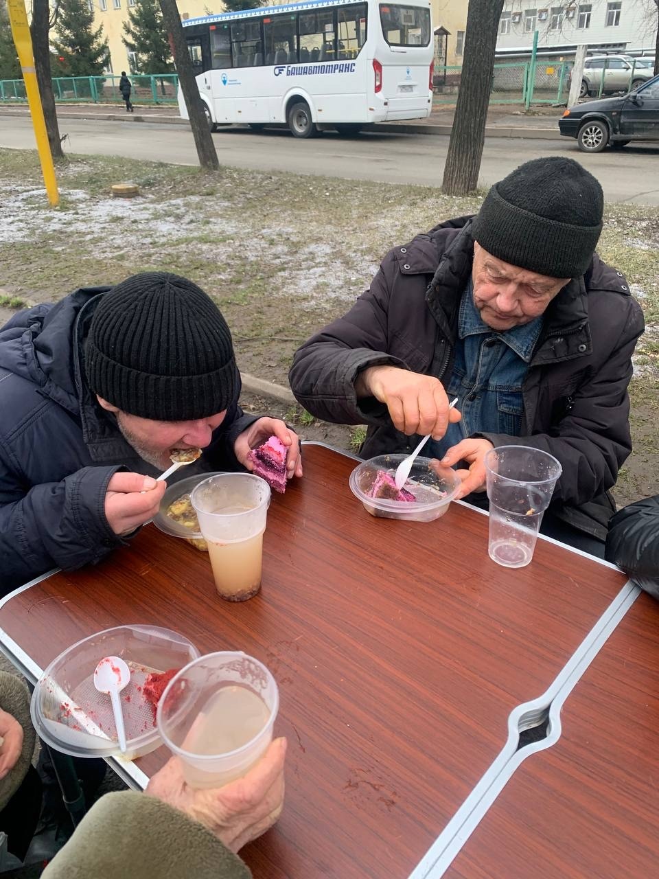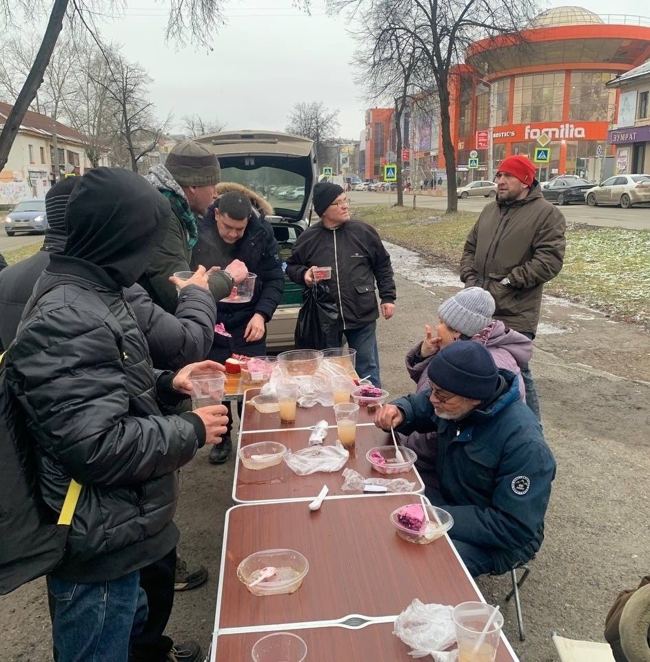 В эту субботу мы привезли нашим подопечным — гречневый суп с курицей, хлеб, кондитерские изделия и фруктовый компот