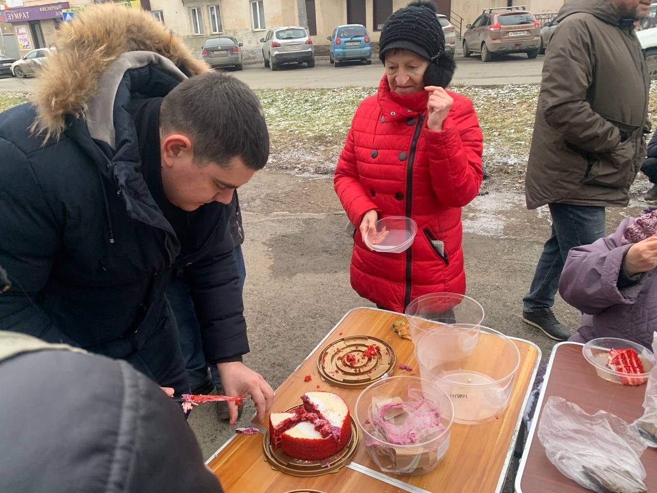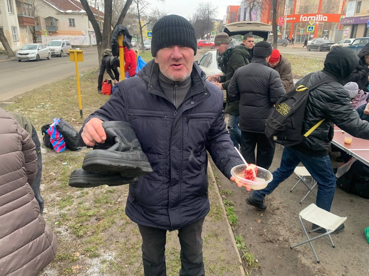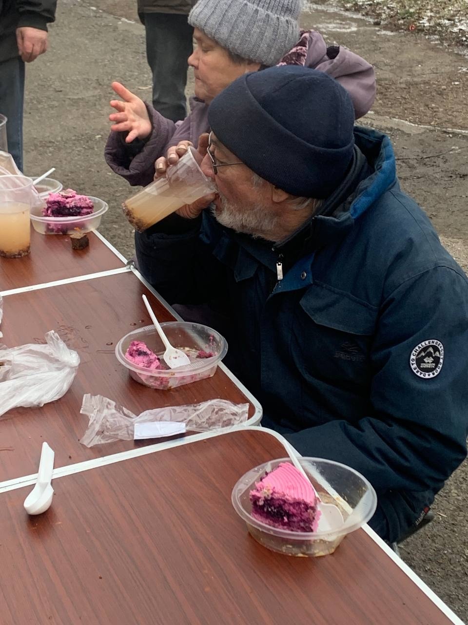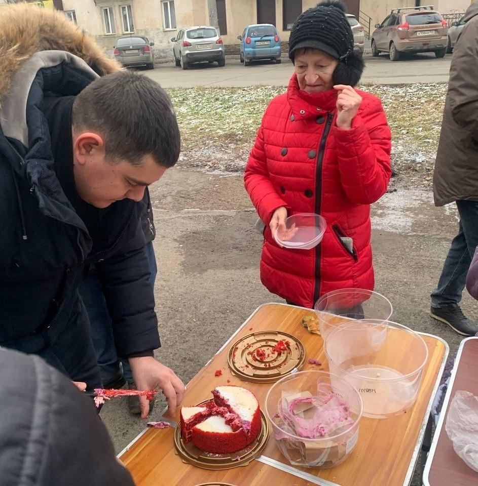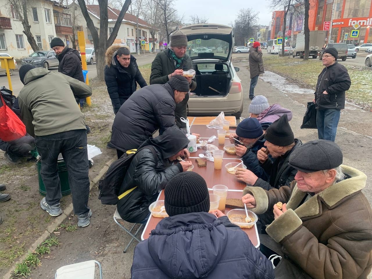 В эту субботу мы привезли нашим подопечным — гречневый суп с курицей, хлеб, кондитерские изделия и фруктовый компот